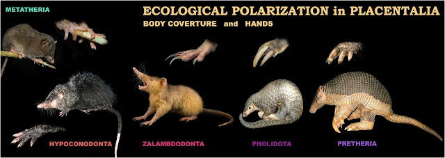 1) Zalambdodonta with conservative teeth similar to those of the marsupials and no doubt to the first Theria. Small animals with tiny eyes (or even absent), incomplete zygomatic arches, large nails and absence of a "caecum", similar to those points to Pholidota (with the exception of the teeth, of course). I put it in the "pole" next to them.